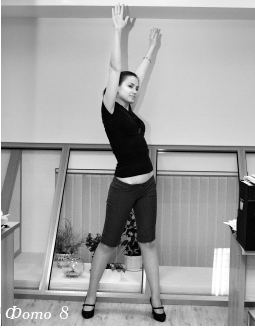ИП стоя, ноги на ширине плеч. Поднять прямые руки вверх, потянуться и за-тем выполнить 6—8 рывков назад. Фото 7
