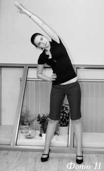 Поочередные пружинистые наклоны в стороны с поднятой разноименной прямой рукой. При наклоне рука тянется вверх и в сторону. Фото 11
