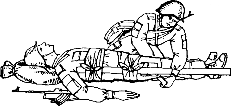 73. Оказывать помощь раненому с переломами костей, а также переносить или оттаскивать его необходимо осторожно, так как острые костные отломки могут повредить кровеносные сосуды и вызвать сильное кровотечение или проткнуть кожу, превратив закрытый перелом в открытый (более тяжелый). Кроме того, резкая боль при неосторожном переносе (эвакуации) может вызвать шок у раненого.