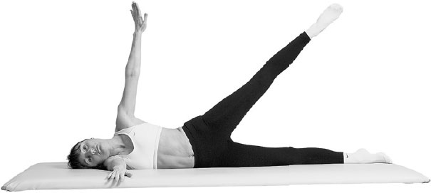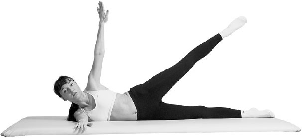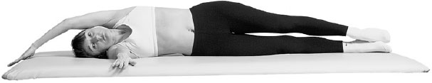 И. п.: лежа на правом боку, правая рука вытянута перед собой ладонями вниз. Левая вытянута вверх через голову и касается ладонью пола.
