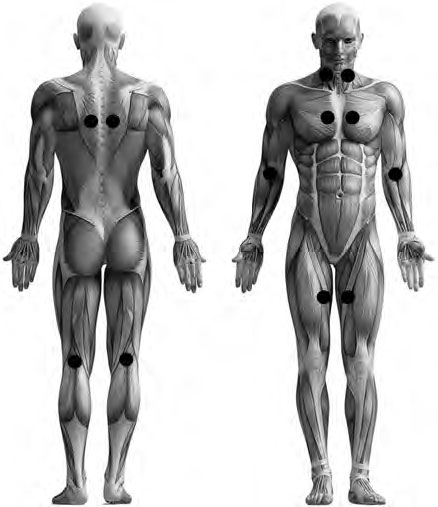 Для лечения дистрофии миокарда рекомендуется использовать методику чрескожного полизонального последовательного лазерного воздействия (рис. 22) на сосудисто-нервные сплетения (мощность лазерного излучения – 20 мВт, частота импульсного лазерного излучения – 150 Гц, время экспозиции на 1 зону – 1–1,5 мин), а также чрескожное лазерное воздействие на проекции сердца – IV–V межреберья справа и слева по краю грудины и на паравертебральные зоны на уровне углов лопаток (мощность лазерного излучения – 20 мВт, частота импульсного лазерного излучения – 150 Гц, время экспозиции на 1 зону – 1 мин). Курс лечения – 10–15 сеансов.