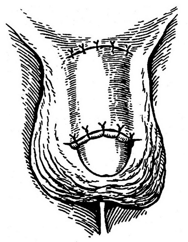 Для этого у корня и дна мошонки выполняют два горизонтальных разреза на расстоянии друг от друга, равном величине раневой поверхности на половом члене. Кожу между разрезами отслаивают и в образовавшийся туннель помещают половой член. Накладывают швы между остатками кожи у головки полового члена и кожей мошонки и ушивают разрез кожи мошонки у корня полового члена. Через 2–3 недели с обеих сторон параллельными половому члену разрезами рассекается кожа мошонки и половой член с лоскутом кожи высвобождается из нее. Края оставшейся на половом члене кожи мошонки сшиваются на задней его поверхности. Рана на мошонке ушивается.