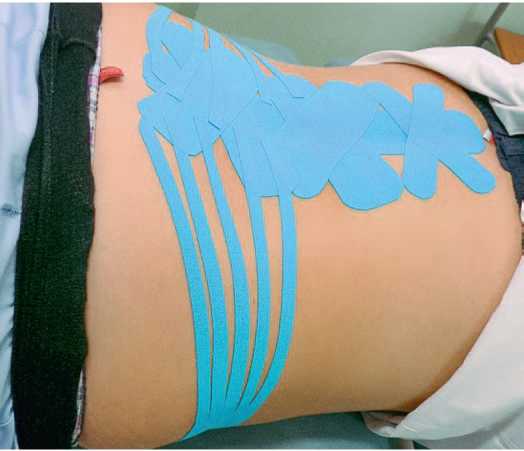 Техника тейпирования. Первичное наложение первого тейпа послабляющей коррекции по всей длине позвоночника от S2 до Th11. Наложение всех тейпов послабляющей коррекции с натяжением 40 %. Лимфотейпинг к подвздошным лимфоузлам.