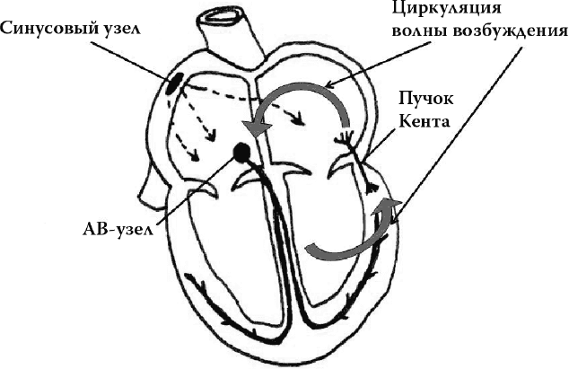 Неприятность возникает тогда, когда электрический импульс в прямом направлении проводится как обычно, а обратно вдруг возвращается через дополнительный путь проведения. Возбуждение зацикливается, импульс начинает циркулировать по кругу, возникает тахикардия наподобие той, которую мы обсуждали в предыдущем разделе.