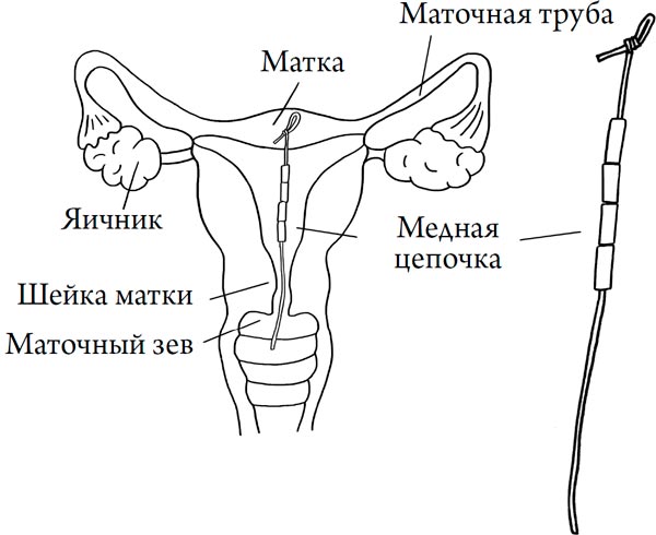 Очень интересная и намного лучше зарекомендовавшая себя альтернатива – это маленькая медная цепочка – нить, которую вводят тонким зондом в мышцу матки, где она может оставаться до пяти лет. Эта цепочка состоит из четырех или шести крошечных медных цилиндриков, нанизанных на нейлоновую нить; ее имплантируют «на крышу» матки как пирсинг. Она филигранно тонкая, подвижная, и ей найдется место даже в самой маленькой матке, а значит, она подходит девушкам и нерожавшим женщинам.