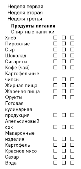Заполняйте ячейки в конце каждой из трех недель курса очищения – это позволит оценить эффективность вашей борьбы со своими пристрастиями. Вы заметите, что ваши потребности в первую неделю существенно отличаются от потребностей второй и третьей недель. Причина – в том, что вы «переучиваете» организм, и постепенно он перестает воспринимать очень сладкое (пирожные и шоколадные конфеты) и соленое (чипсы).