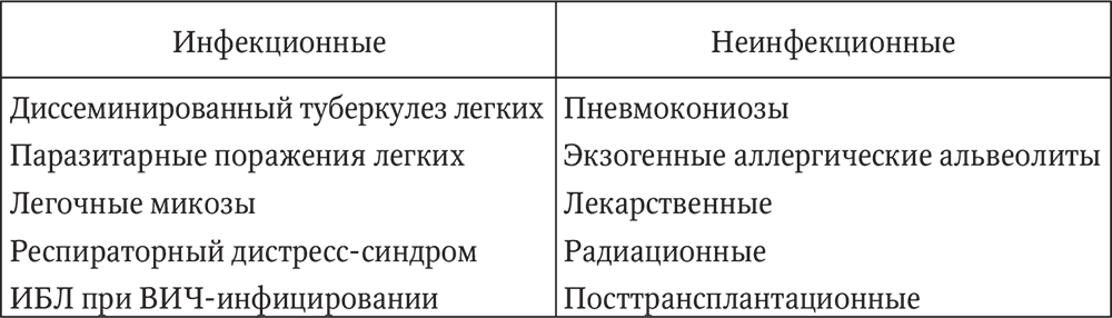 Ряд авторов предлагают исключить из понятия ИБЛ туберкулез, пневмокониозы, легочные диссеминации опухолевой природы и ряд других заболеваний с известными этиологическими факторами и патогенетическими механизмами и рассматривать их в рамках дифференциальной диагностики с ИБЛ неясной этиологии, которые объединяются в понятие «идиопатический легочной фиброз».
