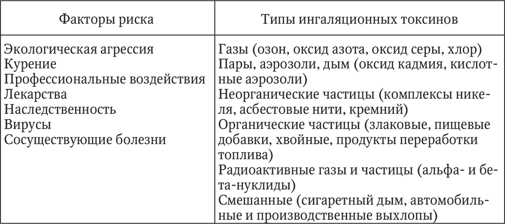 Среди факторов риска поражений легочного интерстиция по типу ИФА обсуждается роль курения, системных заболеваний, лекарств, профессиональных и связанных с внешней средой поллютантов (табл. 18). Особое внимание уделяют роли вирусных инфекций в генезе воспалительных и фибропластических изменений в легких.