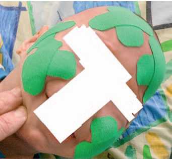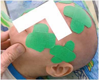 Наложение тейпов с техникой послабляющей коррекции на области: 1) лобных бугров; 2) область висков; 3) область скуловой кости, щек. Степень натяжения 5-10-15-20 % (рис. 9, а, б).