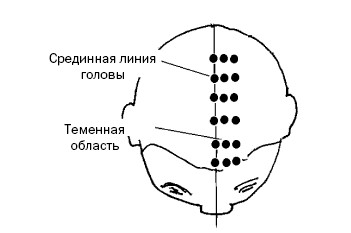 Начинаем работу с надавливания срединной линии головы (рис. 41, а). От лицевого края волосистой части головы до макушки надавливаем 6 точек, расположенных на равном расстоянии друг от друга. При самомассаже надавливание производится совмещенными указательным и средним пальцами по 3 секунды на каждую точку.
