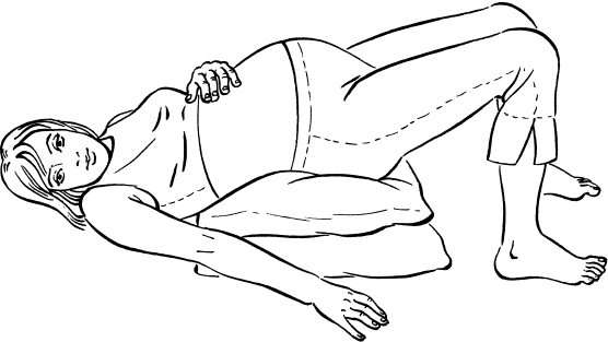 «Полумостик». Лягте на спину, подложив что-нибудь под поясницу таким образом, чтобы таз приподнялся на 20–30 см выше головы. В таком положении следует оставаться 5–15 минут. Под действием силы тяжести головка ребенка упирается в дно матки, а сам ребенок (которому это, видимо, не очень нравится) часто разворачивается в головное предлежание.