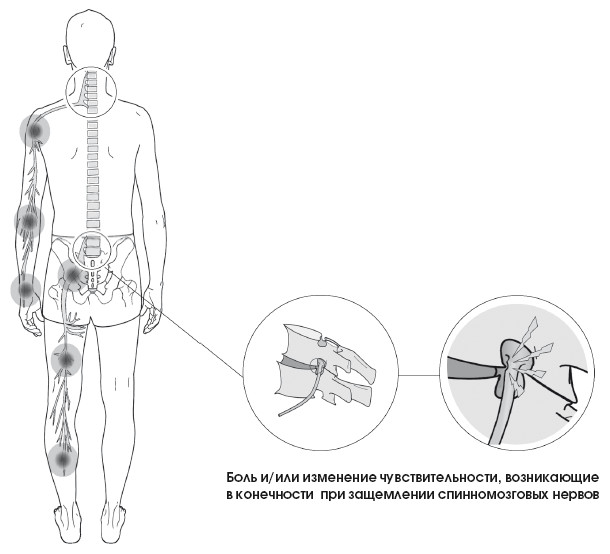 • В определенных случаях протрузии или грыжи дисков из-за деформации диска и выхода внутренней жидкости, контактирующей с нервными корешками.