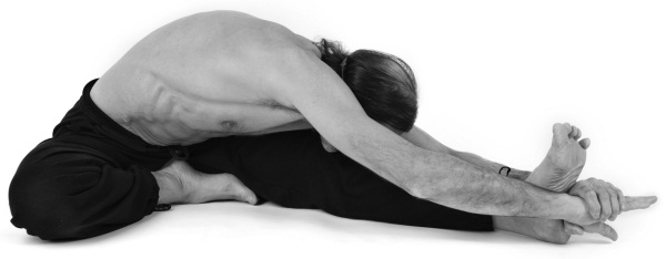 Прижимая тыльную часть колена жестко выпрямленной ноги к полу и сгибая локти, медленно продолжайте наклон. Стремитесь к тому, чтобы сцепить пальцы рук в замок за пяткой, лоб опустить на колено, а локти на пол — конечному положению данной асаны.