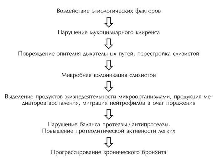 Схематически основные патогенетические факторы развития и прогрессирования хронического бронхита представлены на рис. 1.