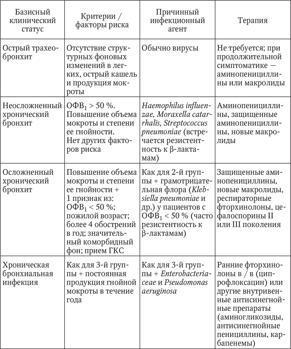 В подавляющем большинстве случаев антибиотикотерапия при обострении хронического бронхита назначается эмпирически. На основании факторов риска, возраста, функциональных особенностей больных, а также причинных факторов (группы микроорганизмов) было предложено несколько классификационных схем лечения обострения хронического бронхита. Это позволяет оптимально использовать различные группы антибиотиков и значительно снизить вероятность неуспешной терапии обострения хронического бронхита. Представленная в табл. 4 схема является современной модификацией классификации, предложенной в 1997 г. интернациональной группой специалистов по легочным и инфекционным заболеваниям.