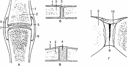 1 – надкостница; 2 – кость; 3 – волокнистая соединительная ткань; 4 – хрящ; 5 – синовиальная мембрана; 6 – фиброзная мембрана; 7 – суставной хрящ; 8 – суставная полость; 9 – щель в межблоковом диске; 10 – межблоковый диск