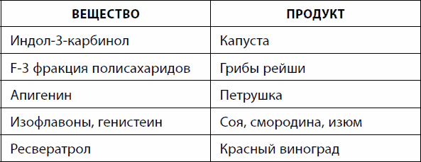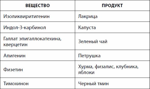 Гормон роста регулирует развитие нашего тела посредством гормоноподобных белков факторов роста. Один из таких белков, образующийся в печени по сигналу от гормона роста, поступает в кровь и активизирует процессы роста и деления клеток во всех тканях тела. Этот белок называется инсулиноподобным фактором роста (IGF-1). Сигнал от IGF-1 поступает в любую клетку, на поверхности которой есть соответствующий рецептор, который, в свою очередь, активизирует внутри клетки киназу PI3K. Как мы помним, киназы – это передаточный механизм от гормонального сигнала к клеточному «штабу» – ядру. В результате гормональной активации PI3K запускает рост и деление клеток, в том числе через уже известный нам белок mTOR. Однако рост и деление клетки – очень энергозатратный процесс, поэтому в это время выключается устойчивость клетки к стрессам. Клетка может делать либо одно, либо другое – либо делиться, либо хорошо защищаться от повреждений. Поэтому при активации киназы PI3K ошибки накапливаются, и мы стареем с большей скоростью. PI3K знаменита тем, что мутация в гене, кодирующем этот белок, у модельного животного нематоды продлила жизнь до 10 раз. Киназа PI3K есть у всех животных, а также у человека. Известны вещества, которые подавляют активность PI3K в клетке. Когда период активного роста организма уже позади, снижение активности PI3K может быть хорошей стратегией с целью замедления старения. Отрадно, что вещества, снижающие активность PI3K, есть в некоторых пищевых продуктах (табл. 24).