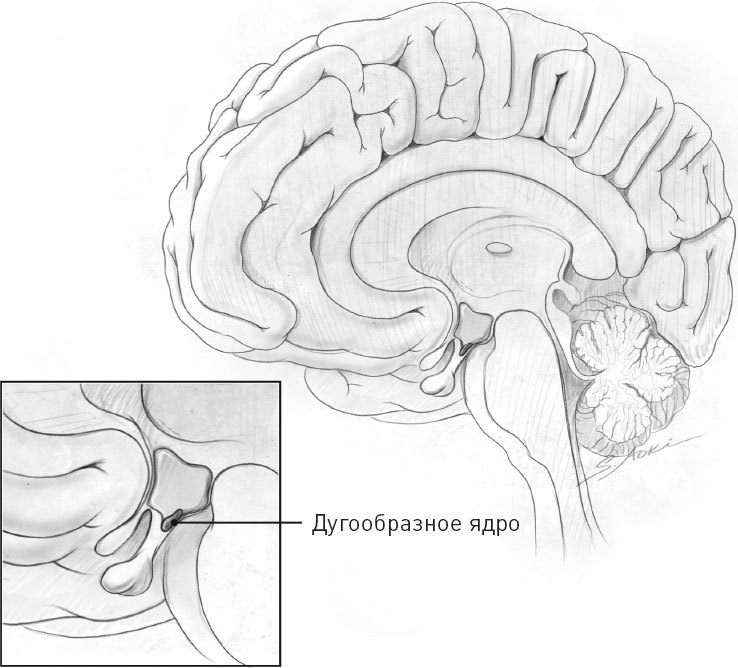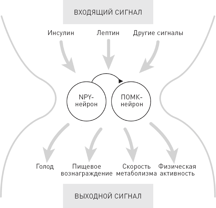 За три года до начала стажировки Шварца исследователь Сатья Карла обнаружила, что инъекция белка под названием нейропептид Y (NPY) в мозг крысы вызывает приступ переедания. Кроме того, ученые выяснили, что NPY производят нейроны дугообразного ядра, которое находится в гипоталамусе рядом с вентромедиальным ядром гипоталамуса, или центром сытости. Концентрация нейропептида Y возрастает после голодания, поэтому ученые предположили, что NPY отвечает за чувство голода (рис. 34). Эти сведения позволили Шварцу, Порте и Вудсу выдвинуть теорию о существовании в мозге некоего аппарата, который контролирует объем потребляемой пищи и состояние адипозности.