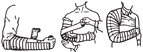 • шину фиксировать к конечности на всем протяжении бинтами, косынками, оставляя пальцы свободными, чтобы можно было следить за состоянием тканей фиксированной конечности;
