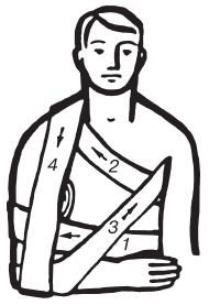 Обездвиживание можно обеспечить, зафиксировав поврежденную руку к туловищу с помощью бинтовой повязки Дезо (рис. 5.7), ногу — к здоровой ноге, т. е. применить способ аутоиммобилизации (рис. 5.8).