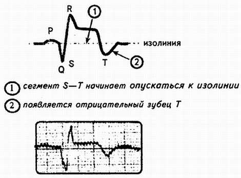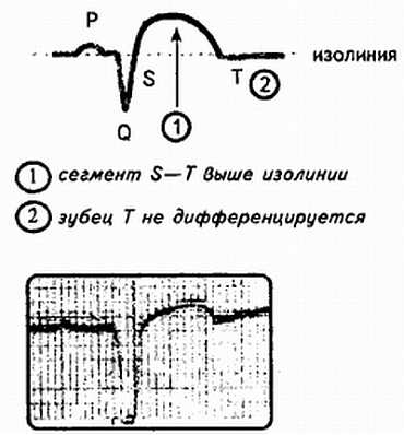 Последние регистрируются на ЭКГ ленте подъемом сегмента S-Т в отведениях, расположенных над зоной инфаркта. Подъем сегмента S-Т маскирует зубец Т, которого в этой стадии практически не видно.
