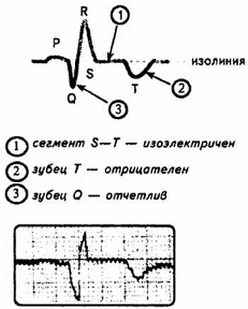 Постепенно ионы калия, излившиеся в зону некроза, вымываются из нее, сила токов повреждения начинает ослабевать, и сегмент S-Т постепенно опускается к изолинии. Одновременно с этим процессом явно начинает контурироваться отрицательный зубец Т. По достижении сегментом S-Т изоэлектрической линии заканчивается подострая стадия и процесс переходит в стадию рубцевания.