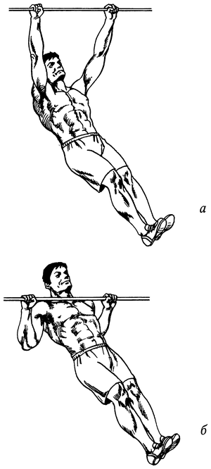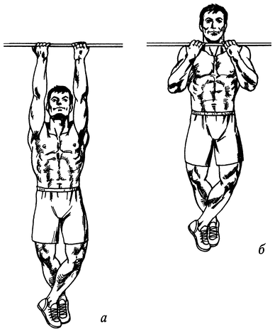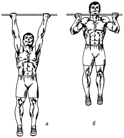Повисните на перекладине (хват — обратный, не уже плеч) (рис. 43, а). Полностью выпрямите руки, слегка прогнитесь в грудном отделе позвоночника. Сводя лопатки, поднимитесь вверх, стараясь коснуться перекладины средней частью груди (рис. 43, б). Не делая пауз и контролируя движение, вернитесь в исходное положение.