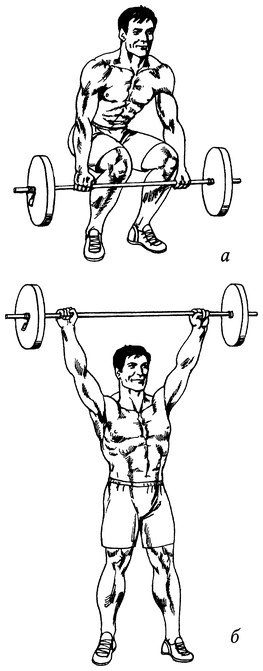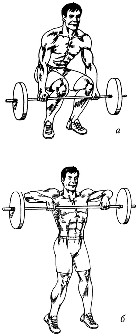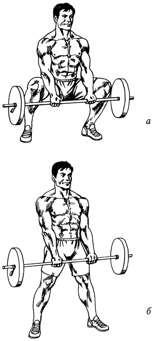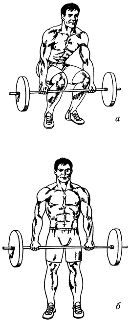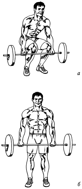Встаньте перед штангой. Глубоко присядьте, возьмитесь за гриф максимально широким хватом и выпрямите спину (рис. 47, а). Отталкиваясь ногами от пола, поднимитесь вверх и выпрямитесь (рис. 47, б). Вернитесь в исходное положение, поставив штангу на пол.