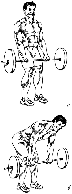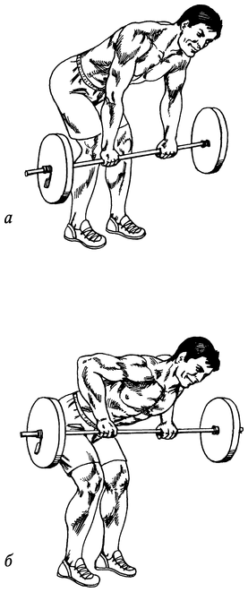 Взяв штангу, наклонитесь вперед, опустив гриф немного ниже колен (рис. 48, а). Спина прогнута, ноги чуть согнуты в коленях. Не меняя положения корпуса, потяните гриф к поясу, сводя лопатки (рис. 48, б). Плавно опустите штангу в начальное положение.
