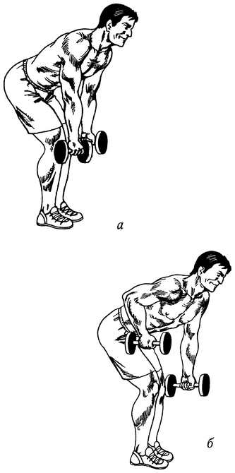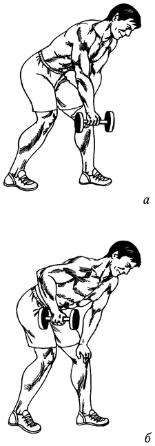 Возьмите в руки гантели, поставьте ноги чуть уже (!) бедер и наклонитесь, прогнувшись в пояснице, так, чтобы гантели оказались ниже уровня коленей (рис. 51, а). Подтяните правую гантель к поясу, начиная тягу с движения лопатки.