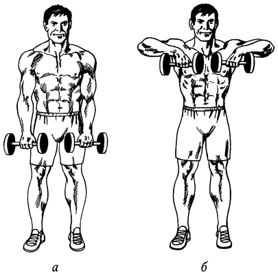 Встаньте прямо, опустив гантели по сторонам корпуса, как показано на рис. 59, а. Не помогая себе корпусом, поднимите гантели как можно ближе к плечам (рис. 59, б). Немедленно вернитесь в исходное положение и повторите.
