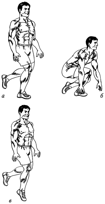 Прыжковая королевская становая тяга Встаньте на одну ногу, носок другой ноги оторвав от пола и поместив позади себя. Руки расположите по сторонам корпуса (рис. 56, а). Наклонитесь вперед, приседая на опорной ноге (рис. 56, б). Выпрямляя ее, выпрыгните вверх (рис. 56, в). Мягко приземлившись, повторите. Смените ногу после нужного количества повторов.