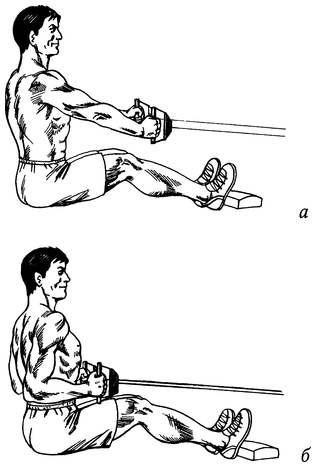 Сядьте на пол перед нижним блоком или на тренажер. Взяв в руки узкую рукоять и выпрямив спину, отпустите плечевой пояс вперед, максимально разведя лопатки (рис. 57, а). Начните движение со сведения лопаток, а затем, сгибая руки в локтях, подтяните рукоять к середине живота (рис. 57, б). Плавно вернитесь в исходное растянутое положение.