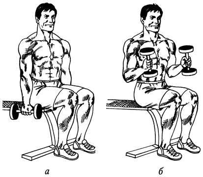 Сядьте на край скамьи, поставьте ноги вместе, в руки возьмите по гантели и выпрямите спину (рис. 58, а). Не смещая локти, поднимите гантели к плечам, с силой сократите бицепсы (рис. 58, б). Досчитайте до двух и вернитесь в исходное положение.