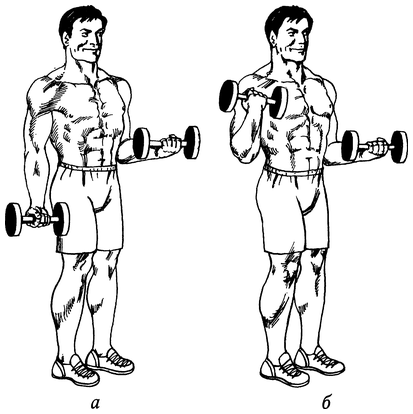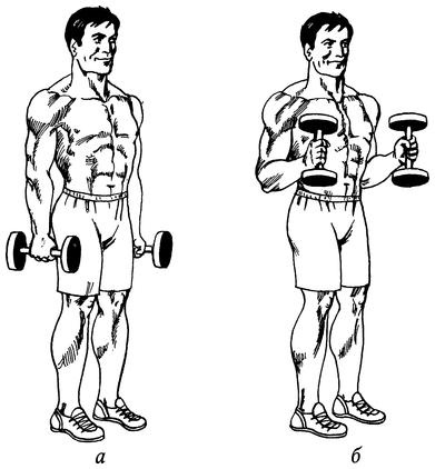 Встаньте прямо, взяв в руки по гантели (рис. 54, а). Начав движение локтями, поднимите гантели вверх, стараясь достичь уровня подбородка (рис. 54, б). Плавно опустите руки в исходное положение. В верхней точке располагайте предплечья под углом 30–40° относительно параллели.