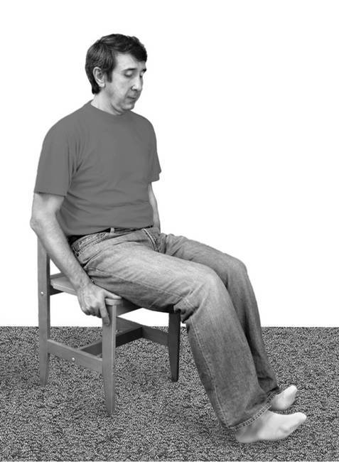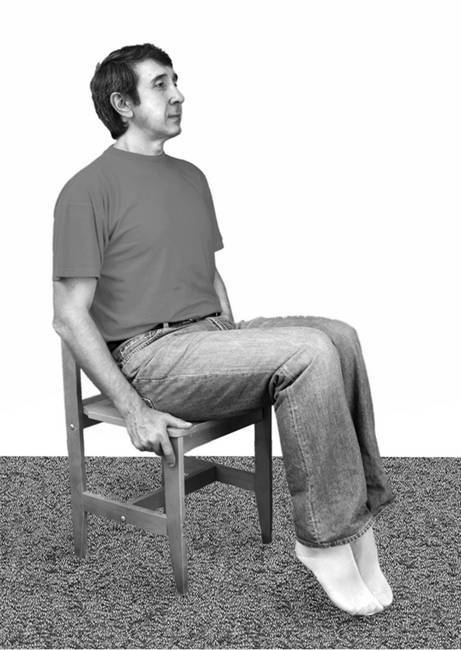 Исходное положение: сядьте на жесткий стул или табурет; ноги согнуты в коленях под прямым углом, кисти либо лежат на коленях, либо придерживают края табурета справа и слева.
