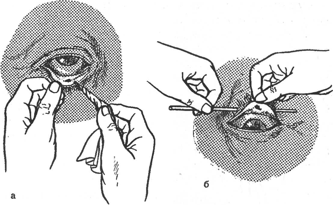 Рис. 61. Удаление инородного тела из глаза, а — из-под нижнего века; б — из-под верхнего века.