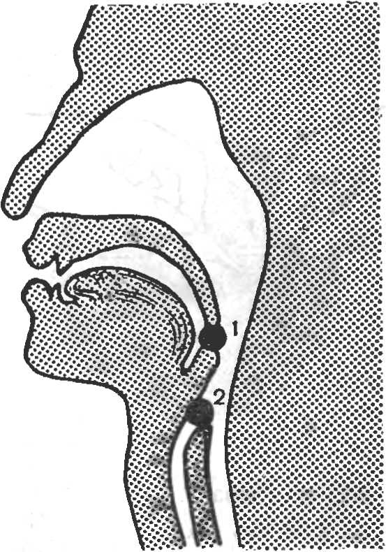 Инородные тела дыхательных путей. Попавшие в дыхательные пути инородные тела приводят к полной их закупорке и развитию асфиксии. Наиболее часто инородные тела дыхательных путей наблюдаются у детей. У взрослых чаще попадает пища при разговоре во время еды или при заболеваниях надгортанника, при неплотном закрытии входа в гортань в момент глотания. Предметы из полости рта при глубоком вдохе вместе с воздухом проникают в гортань и трахею (рис. 62), что вызывает приступ резкого кашля. Инородное тело часто в момент кашля выталкивается. При крупных инородных телах возникает спазм голосовых связок с