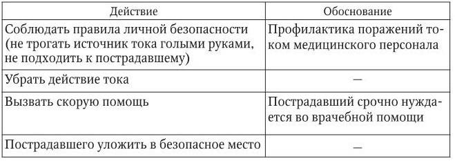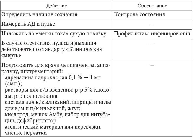 Примечание. При электроожогах возможны разрывы мышц, вывихи и переломы костей. При жалобах на боли в конечностях необходима транспортная иммобилизация. При отсутствии у пострадавшего повреждений, нарушения сердечного ритма и жалоб – доставка в приемное отделение больницы обязательна (может быть отсроченное по времени нарушение ритма).