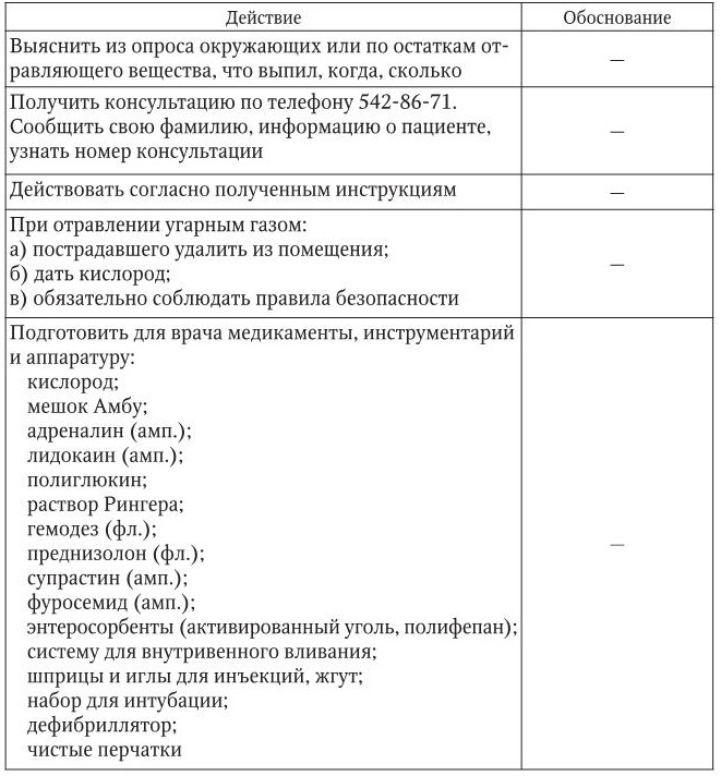 1. При подозрении на отравление химическими и лекарственными веществами проконсультируйтесь с врачом токсикологом по тел. 8(812)542-86-71 (круглосуточно) и действуйте по его указаниям. Запишите в карте вызова данный вам номер консультации и фамилию врача. При необходимости врач центра информации пришлет вам в помощь токсикологическую бригаду.