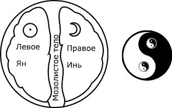 В зависимости от того, каким видом деятельности занят в данный момент человек, доминирует левое или правое полушарие. Логическое мышление, чтение, письмо, решение математических задач активизируют левое полушарие. А слушание музыки, мечтания, воображение и медитация – правое. Здоровый человек получает информацию одновременно из обоих полушарий, поскольку через мозолистое тело происходит постоянный активный информационный обмен. Полярная специализация левого и правого полушарий полностью соответствует древнему эзотерическому учению. В даосизме это называется принципом единого Дао, который распадается на ян (мужское начало) и инь (женское начало). Герметическая[1] традиция использует символы «Солнце» (мужское начало) и «Луна» (женское начало). Ян и Солнце символизируют активный, позитивный, мужской принцип, соответствующий психологической области дневного сознания. Инь и Луна отражают негативный, женский, пассивный принцип и соответствуют бессознательному.