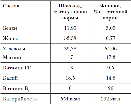Как видите, в молочном шоколаде много жиров. В 100 граммах шоколада содержится половина суточной нормы жира! По содержанию полезных веществ финики практически не уступают шоколаду, а пищевых волокон в них намного больше. Калорийность – в два раза меньше!