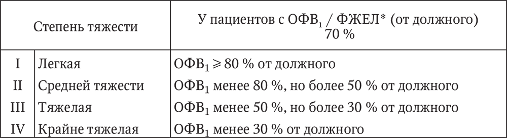 Однако спрактической точки зрения необходимо отметить, что в российской медицинской практике существует достаточно устойчивое разделение ХОБЛ на легкую, среднетяжелую, тяжелую и крайне тяжелую степень тяжести в зависимости от ОФВ1. Подобная формулировка диагноза удобна на всех этапах оказания помощи больным ХОБЛ.