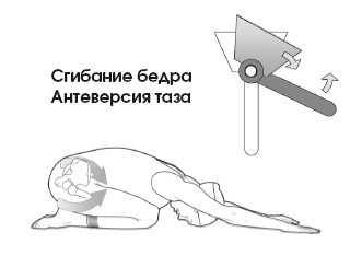 Таз и бедро также могут одновременно совершать движение в тазобедренном суставе. Это происходит, например, когда мы сидим на пятках (движение бедра относительно таза) и при этом смещаем туловище вперед с намерением опереться на мышцы грудной клетки (антеверсия таза).