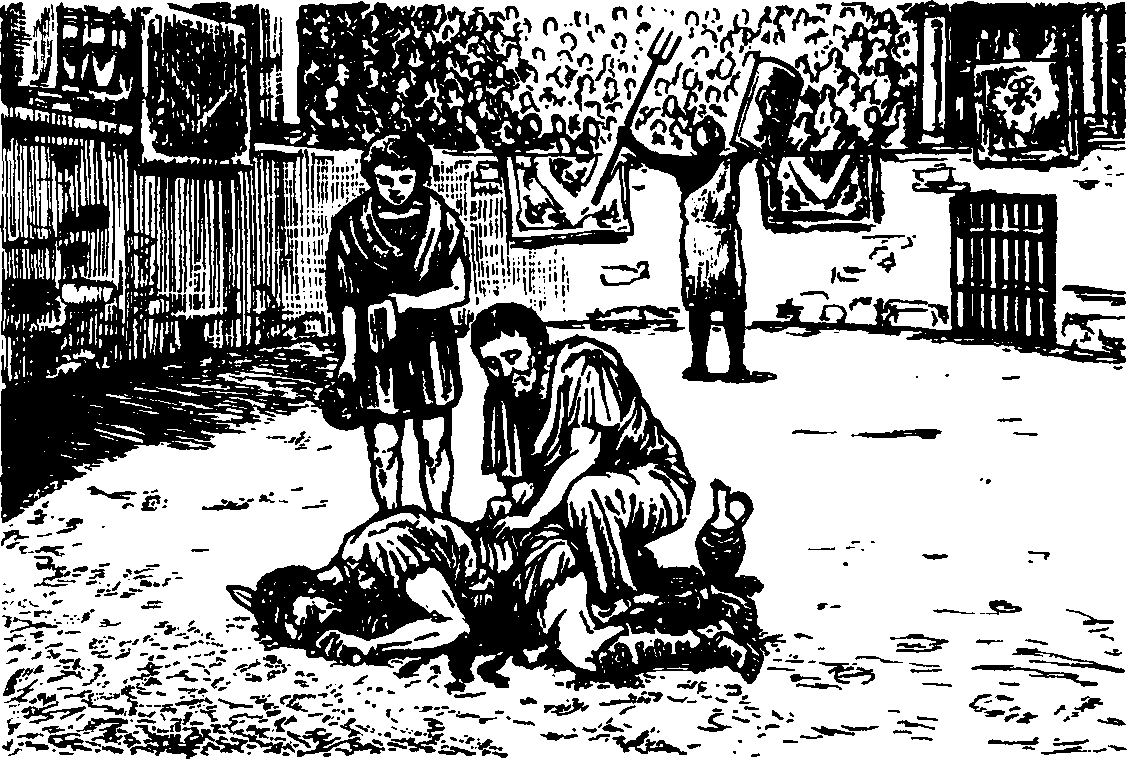 Даже издалека, не подходя близко к стенам каменного цирка города Пергама, можно было расслышать гул и отдельные крики, густой какофонией просачивавшиеся наружу. На арене происходила жестокая схватка между львом и двумя гладиаторами, плененными на северных границах великой Римской империи. Исход битвы был известен заранее: выиграть бой у этого матерого льва ещё никому не удавалось. Вот и теперь, спустя некоторое время, с арены вынесли сначала тело первого гладиатора, а затем появилась группа людей, которая несла второго несчастного. Но эти люди шли быстрым шагом, потому что гладиатор был ещё жив. Он иногда поднимал окровавленную голову, но, не в силах её держать, опускал снова на руки несущих и в конце концов потерял сознание.