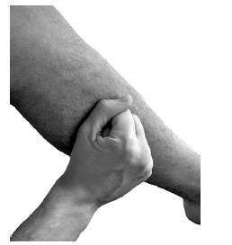 Расположите правую ногу на любую возвышенность, либо можем выполнять массаж в положении сидя, вытянув ноги. Начнем массаж с легких похлопываний ладонью (фото 7, а). Двигаемся от стопы по зонам (см. рис. 29, а):