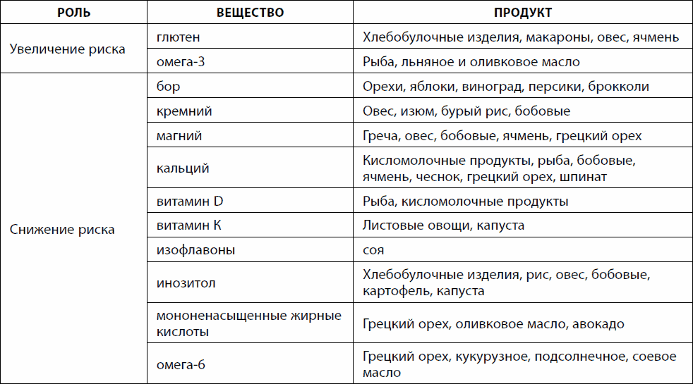 Для профилактики остеопороза у женщин в период после наступления менопаузы рекомендуется употребление продуктов, содержащих кальций, тофу (содержит растительные аналоги женского полового гормона), потребление витамина D из рыбы и более высокое потребление витамина К из листовых овощей. Комбинация кальция, витаминов D и К вместе обязательна. Витамин D способствует усвоению кальция, а витамин К вызывает его закрепление в костной ткани. В противном случае избытки кальция могут откладываться в мягких тканях и на стенках сосудов. Кроме того, для профилактики остеопороза полезны магний, калий, витамин С, витамины группы В и каротиноиды (табл. 18). Регулярное потребление газированных напитков, например колы, оказывает отрицательное влияние.
