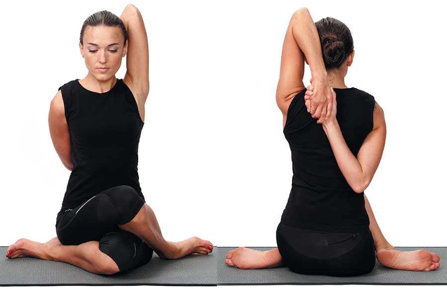 Согните опущенную вниз правую руку в локтевом суставе и заведите ее за спину. В конечном варианте тыльную сторону ладони расположите между лопаток. Поднимите выпрямленную левую руку вверх, согните ее в локтевом суставе и заведите за спину. Ладонную поверхность левой руки опустите по позвоночнику до соприкосновения с правой рукой. После этого соедините руки в пальцевой замок между лопатками. Позвоночник, шею и голову удерживайте в вертикальном положении. Взгляд направьте вперед. Следите за дыханием.