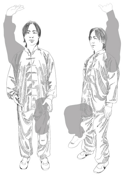 1. Описание движения: встать прямо, стопы параллельно друг другу, руки свободно опущены вдоль тела. Согнуть в колене и поднять правую ногу, одновременно левая рука поднимается над головой ладонью вверх, а правая остается опущенной вдоль тела, ее ладонь при этом развернута к земле. Затем принять исходную позицию и повторить упражнение, подняв левую ногу.