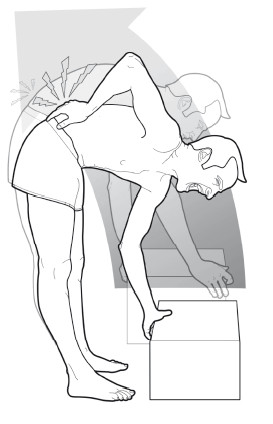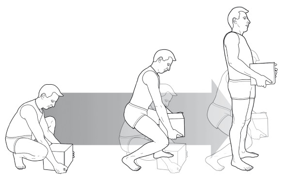 Как правило, если нам необходимо наклониться к земле, нужно делать это с согнутыми коленями. Ни рисунке ниже показано, что при выполнении данного движения позвоночник остается в вертикальном положении или стремится к вертикальному положению, избегая заклинивания дисков и чрезмерного напряжения задней стенки фиброзного кольца. При поднятии предмета с земли следует удерживать его ближе к телу, так как при удерживании предмета на расстоянии появляется эффект рычага, опасный для позвоночника.